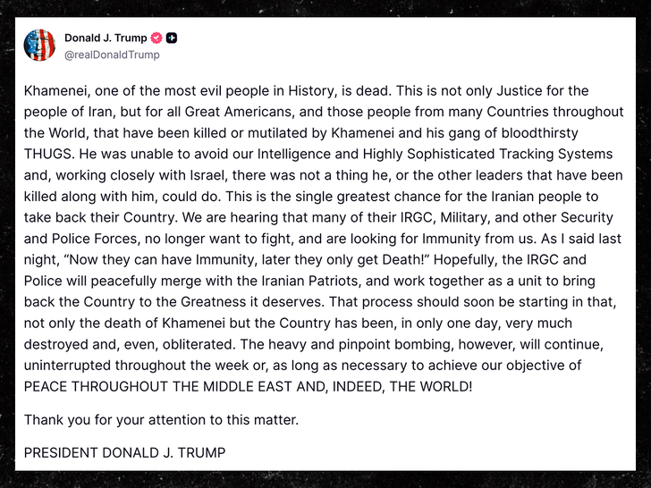 In his post, he called Khamenei “One of the most evil people in History, adding … “This is not only Justice for the people of Iran, but for all Great Americans, and those people from many Countries throughout the World, that have been killed or mutilated by Khamenei and his gang of bloodthirsty THUGS.”