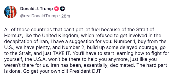 The post says: “All of those countries that can’t get jet fuel because of the Strait of Hormuz, like the United Kingdom, which refused to get involved in the decapitation of Iran, I have a suggestion for you: Number 1, buy from the U.S., we have plenty, and Number 2, build up some delayed courage, go to the Strait, and just TAKE IT.”
