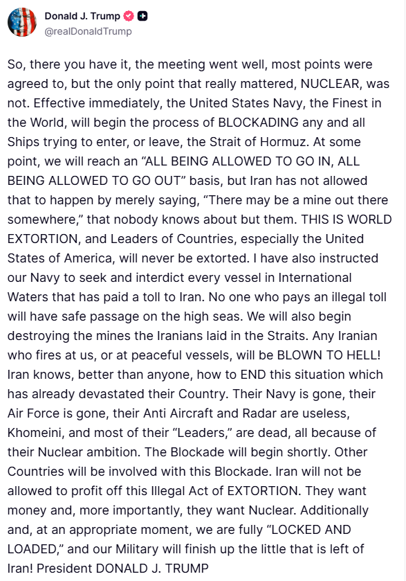 “I have instructed our navy to seek and interdict every vessel in international waters that has paid a toll to Iran,” the US president wrote on Truth Social.